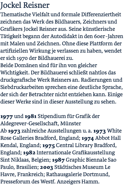 Jockel Reisner Thematische Vielfalt und formale Differenziertheit zeichnen das Werk des Bildhauers, Zeichners und Graf ikers Jockel Reisner aus. Seine künstlerische Tätigkeit begann der Autodidakt in den 60er-Jahren mit Malen und Zeichnen. Ohne diese Plattform der artifiziellen Wirkung je verlassen zu haben, wendet er sich 1970 der Bildhauerei zu. Beide Domänen sind für ihn von gleicher Wichtigkeit. Der Bildhauerei schließt nahtlos das druckgrafische Werk Reisners an. Radierungen und Siebdruckarbeiten sprechen eine deutliche Sprache, der sich der Betrachter nicht entziehen kann. Einige dieser Werke sind in dieser Ausstellung zu sehen. 1977 und 1981 Stipendium für Graf ik der Aldegrever-Gesellschaft, Münster Ab 1973 zahlreiche Ausstellungen u.a. 1973 White Rose Galleries Bradford, England; 1974 Abbot Hall Kendal, England; 1975 Central Library Bradford, England; 1982 Internationale Grafikausstellung Sint Niklaas, Belgien; 1987 Graphic Biennale Sao Paulo, Brasilien; 2003 Städtisches Museum Le Havre, Frankreich; Rathausgalerie Dortmund, Presseforum des Westf. Anzeigers Hamm. Walter G. Breuer Erst spät flammte die Leidenschaft der frühen Jahre